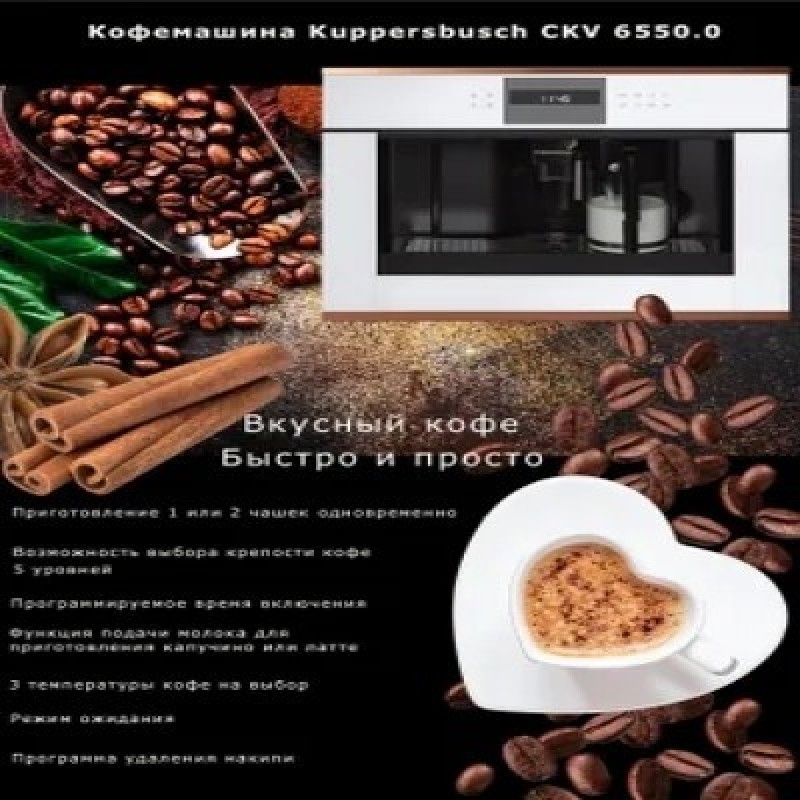 Встраиваемая кофемашина Kuppersbusch CKV 6550.0ЖК-дисплей с текстовым и графическим полями Электронная система управления с сенсорными кнопками Программируемое количество кофе для 5 размеров чашек (эспрессо, малая, средняя, большая, высокая) Приготовление 1 или 2 чашек Функция подачи молока для приготовления капучино или латте Съемный контейнер для молока с функцией очистки Возможность использования кофейных зерен или молотого кофе Регулируемый по высоте раздатчик кофе Давление при заваривании  15 бар 3 температуры кофе на выбор Возможность выбора крепости кофе (5 предварительно заданных уровней) Отдельные нагреватели для заваривания кофе и приготовления горячей воды Программа удаления накипи Автоматическое ополаскивание при включении и отключении Емкость для воды заполняется спереди Электронный таймер с белыми индикаторами Программируемое время включения Режим ожидания Телескопические направляющие для легкого заполнения кофемашиныПодсветка чашек:Наблюдение доставляет удовольствие - хорошо известный факт. Светодиодная подсветка преподносит только что сваренный кофе в правильном свете. И приготовление кофе становится хорошей традициейЕмкость для свежей воды:Духовые шкафы и кофемашины Kuppersbusch легко встраиваются в любую кухонную мебель, так как благодаря наличию емкости для свежей воды подсоединение к водопроводу не требуютсяХарактеристики:Потребляемая мощность: 1,35 кВт (вилка Schuko)Размеры прибора (Ш x В x Г): 595 x 455 x 475 мм (вкл. фасад 20 мм и телескопические направляющие) Размеры ниши (Ш x В x Г): 560 x 450 x 550 мм
